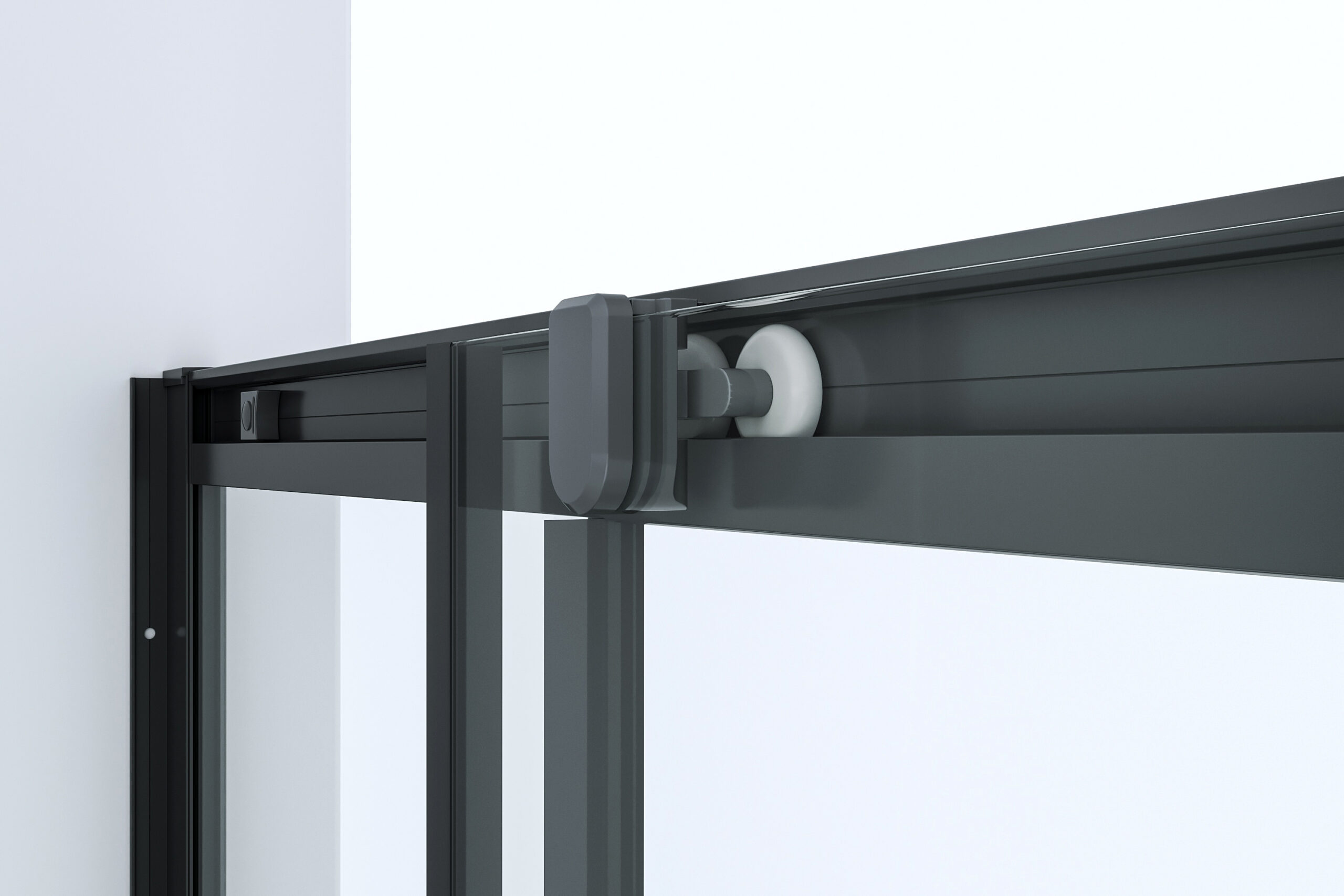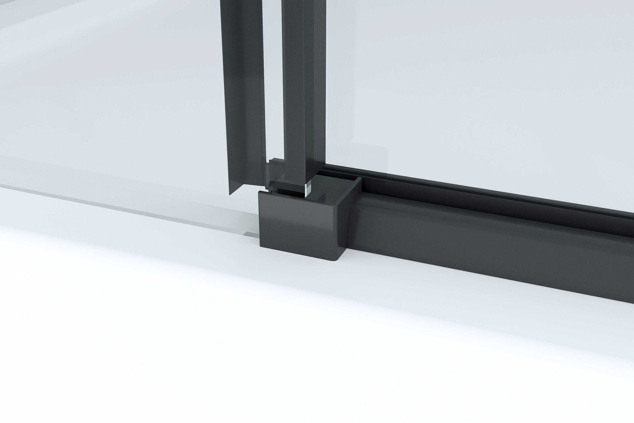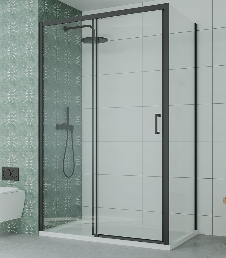Deze douchecabine met matzwarte profielen heeft aan de voorzijde een schuifdeur; deze is verkrijgbaar in 4 breedteafmetingen: 100, 120, 140 en 160 cm. De zijwand is verkrijgbaar in 80 en 90 cm.