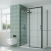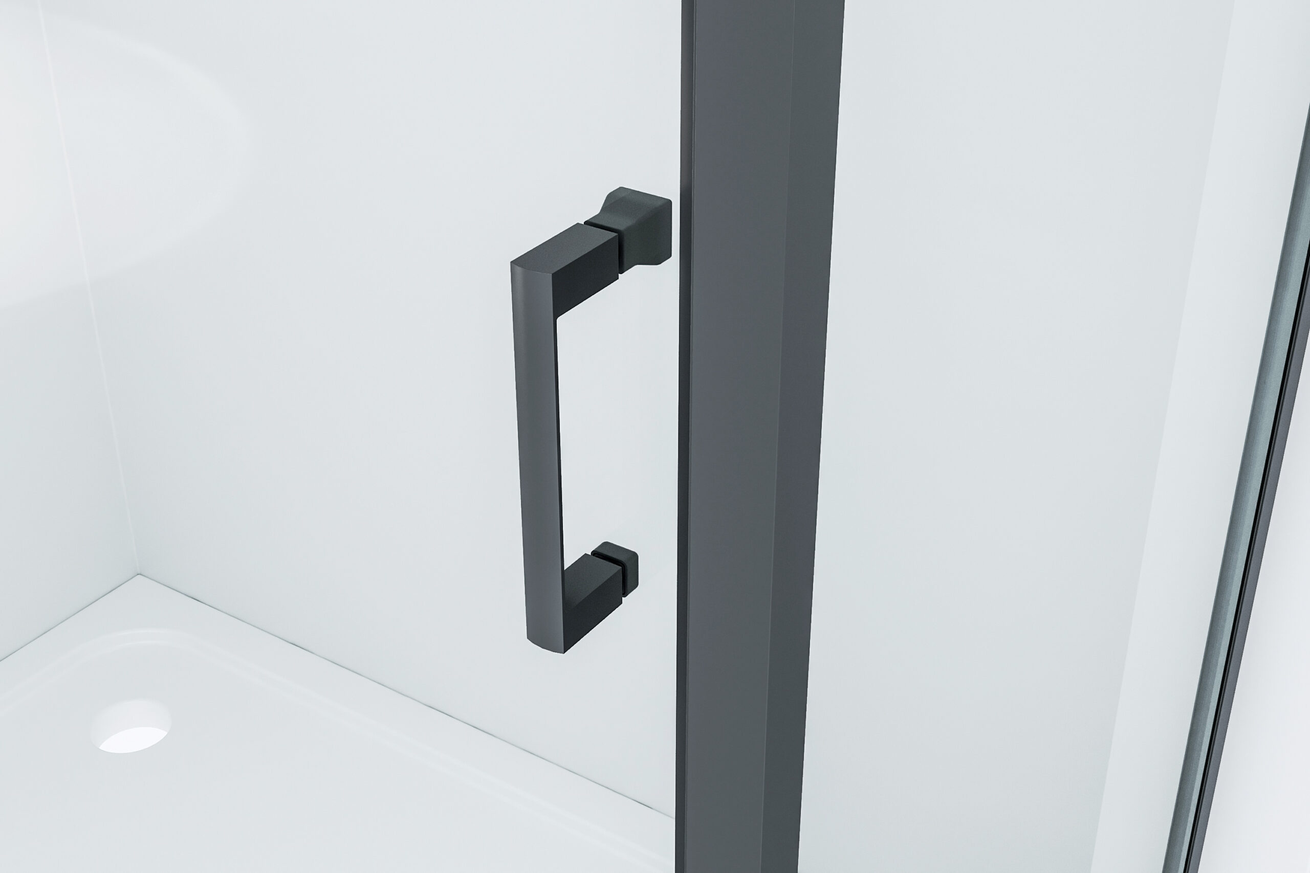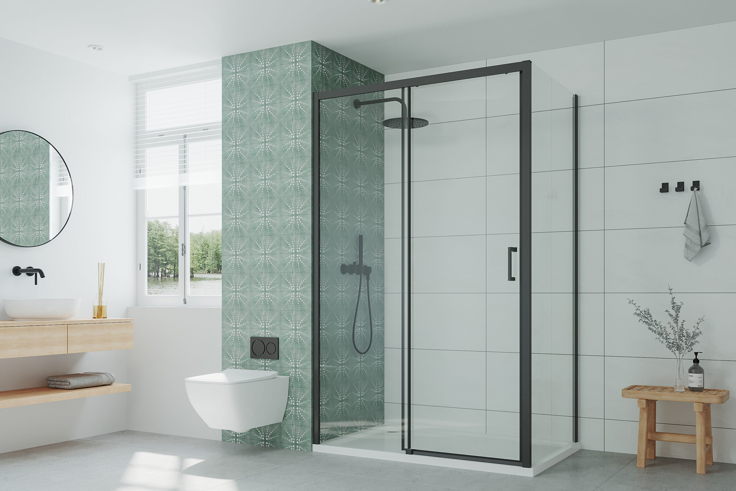 - Rechthoekige douchecabine met 1 schuifdeur en zijwand met matzwarte profielen.